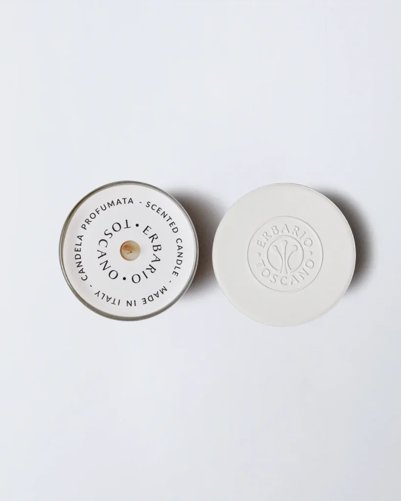 Candela composta da cera vegetale infusa con un’alta percentuale di essenza profumata. Il contenitore in vetro, dal design rigoroso e minimale, si accompagna al coperchio in ceramica naturale con logo a rilievo.